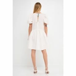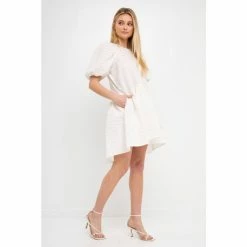 – Jacquard- Back spaghetti tie- Puff half sleeves- High low- Round neckline- Side pockets- Exclusive of Elastic- Total length: 36.50″- Bust: 38″