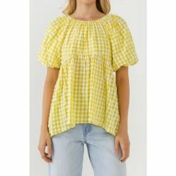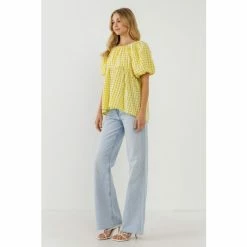 This darling blouson baby doll spaghetti tie top is sure to become a fast favorite in your wardrobe! Puckered woven check in a beautiful fresh hue graces the blouson bodice, shirred round neckline and back spaghetti tie. Short puff sleeves add a touch of whimsy, while the relaxed silhouette flatters any figure. So pretty with denim or white pants!