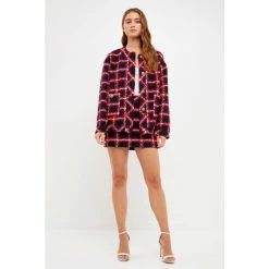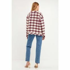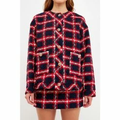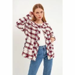 This Check Boucle Tweed Jacket from English Factory is a must-have for your fall wardrobe. The round neckline and patch pockets are both functional and stylish. The buttoned closure ensures a perfect fit every time. Made from high-quality material, this jacket is sure to keep you warm all season long.