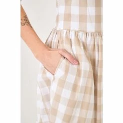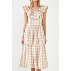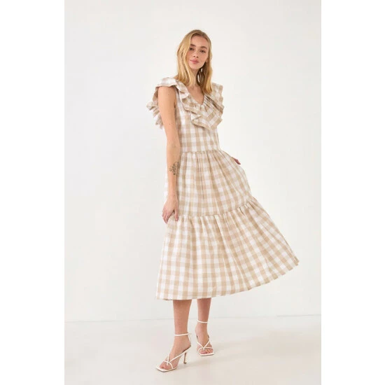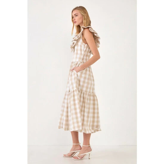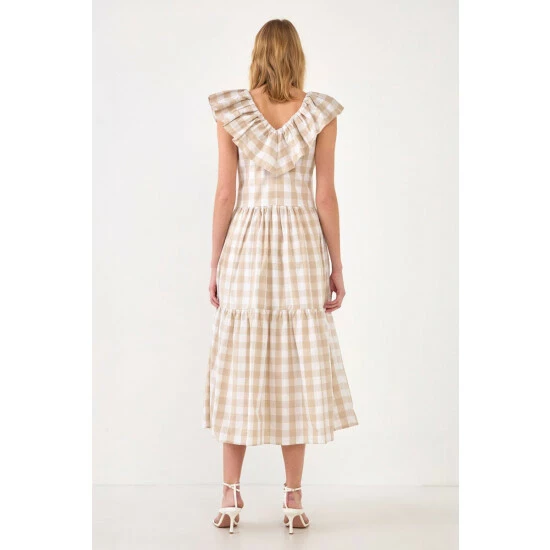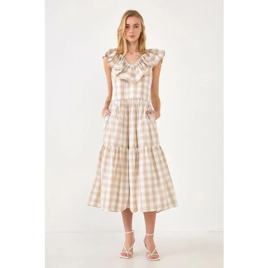 Playful checks sweeten this crisp cotton midi styled with a ruffled neckline and a flouncy tiered skirt.