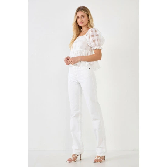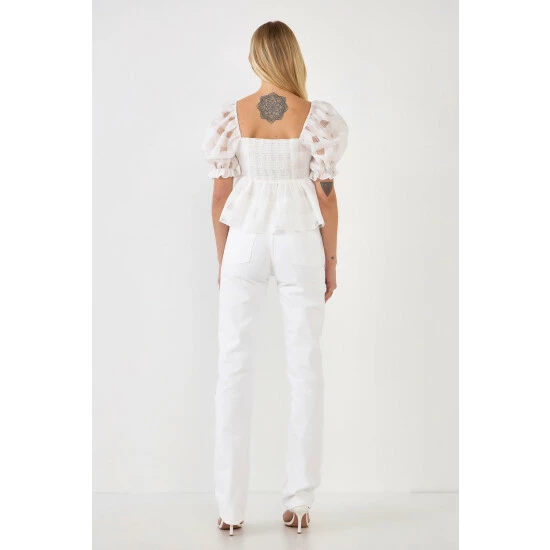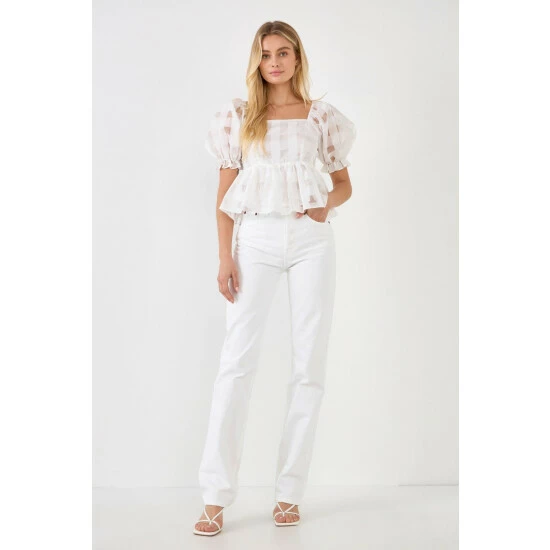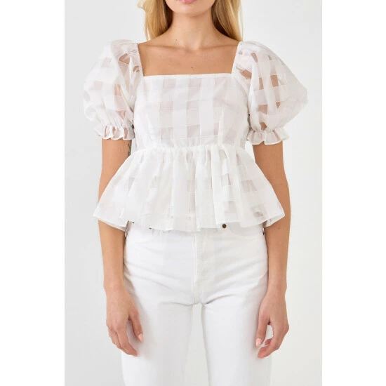 Elevate your style this season with the chic and stylish checker organza top. showcase your feminine flair with this sheer blouse. Boasting short puff sleeves and a lined bodice, this top is perfect for any special occasion. With its classic square neckline, this blouse is a modern take on a timeless style. Wear it with trousers or a skirt for an elegant look that will turn heads.