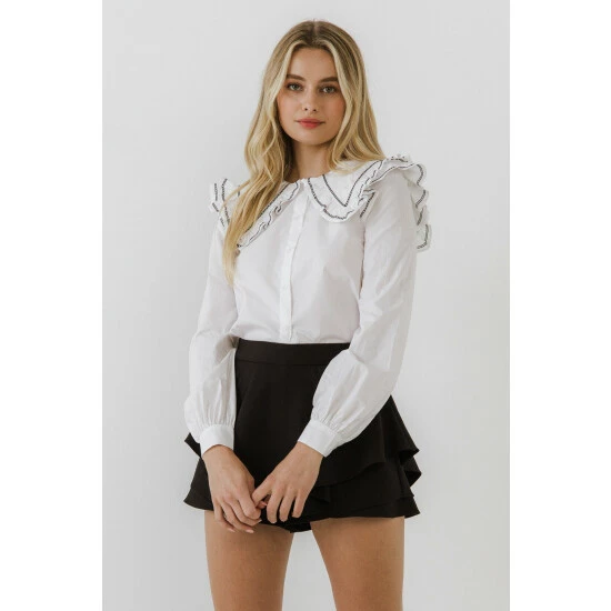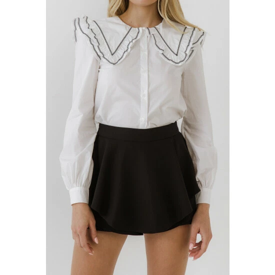 – Big collar blouse- Embroidery trim- Long puff sleeve- Regular fit- Regular length