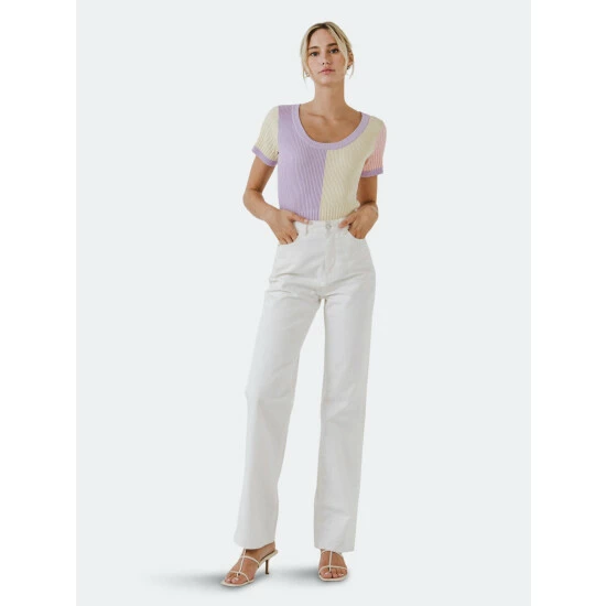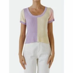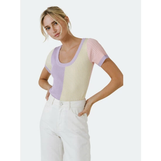 – Color-blocked- Knitted fabric- Ribbed at neckline, cuffs, and bottom opening- Total length: 18.75″, Bust: 26.50″