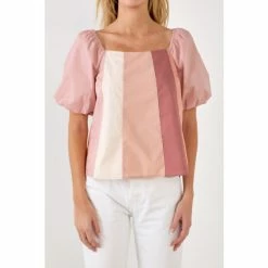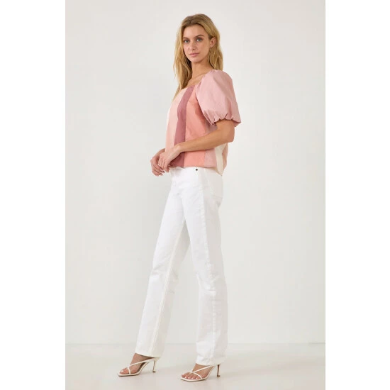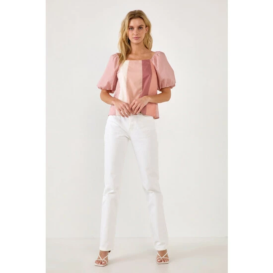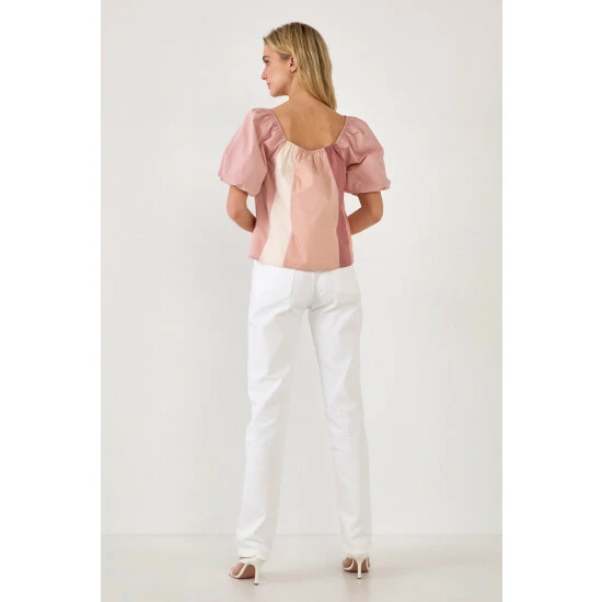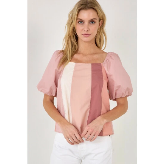 – Color-blocked- Puff sleeves- Elastic inserted at sleeve and back- Square neckline