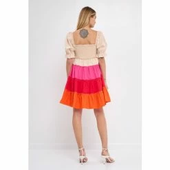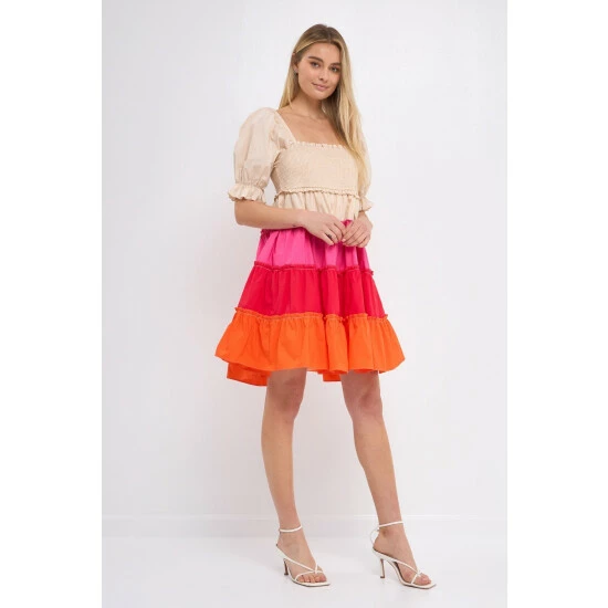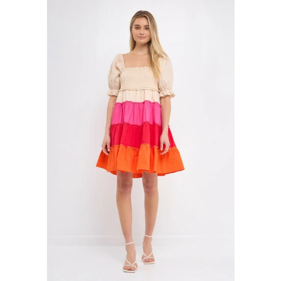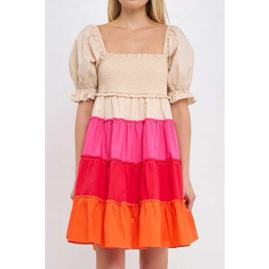Add a pop of color to your wardrobe with this colorblock smocked puff sleeve mini dress. The smocked bust detail and puff sleeves give this dress a fun and flirty look, while the tiered skirt detail adds a touch of elegance. This dress is perfect for a night out on the town or a day at the office.