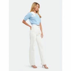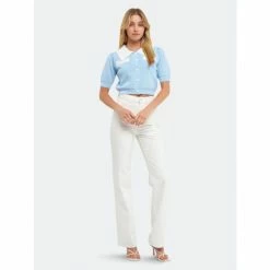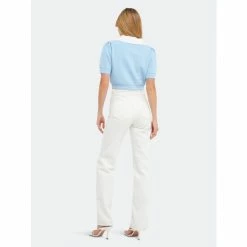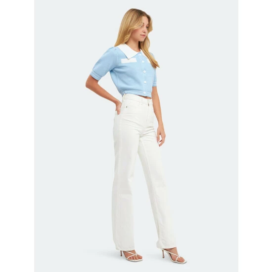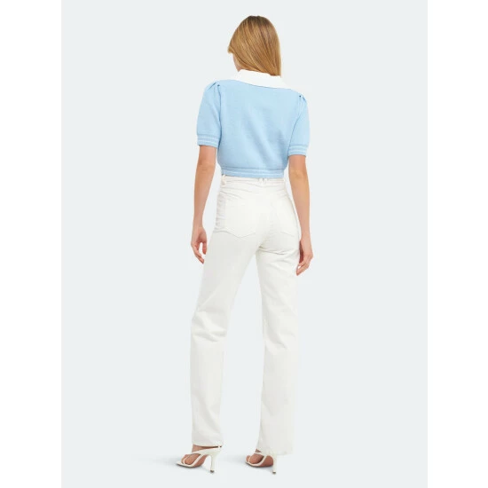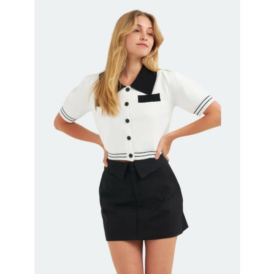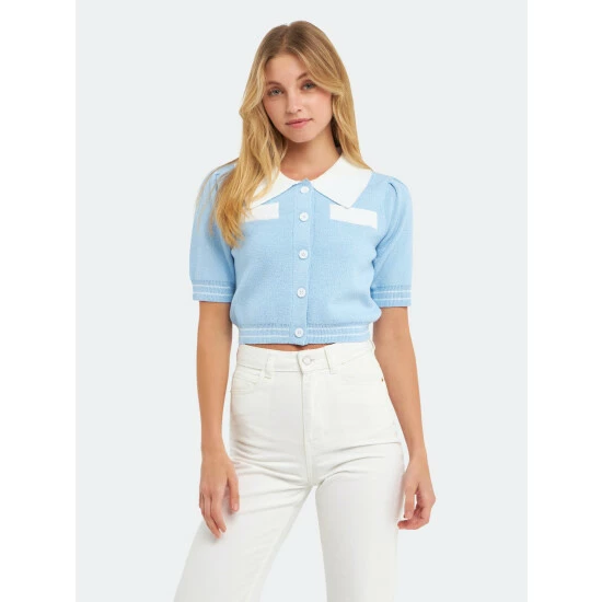 – Short puff sleeves- Contrast collar and facke welt pocket- Crop length- Front button closure- Total length: 17.25″, Bust: 34.50″