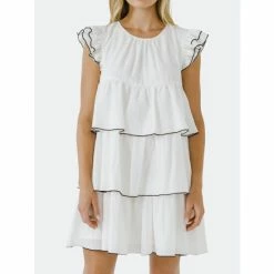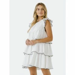 This must-have dress features contrast trim and features a ruffle layered bodice. Pair with a great set of sandals or heels for an impeccable look.
