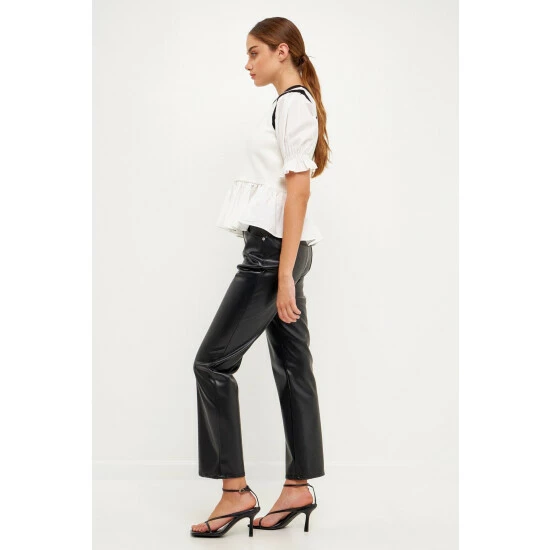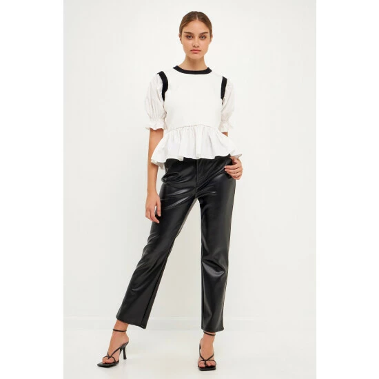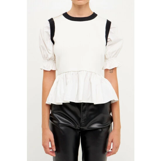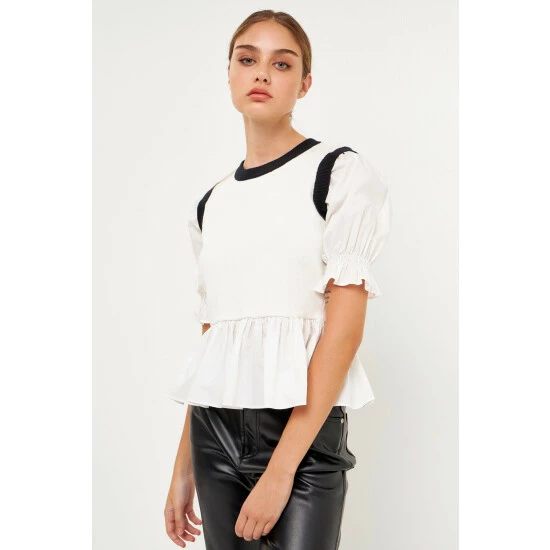 With the perfect mix of feminine and tomboy details, this top was made for a versatile style. The round neckline and short puff sleeves keep it sweet while the contrast details and peplum waist add just the right touch of edge. Whether you’re dressing it up with some skinny jeans and heels or keeping it casual with some joggers, this top is sure to be a new favorite.