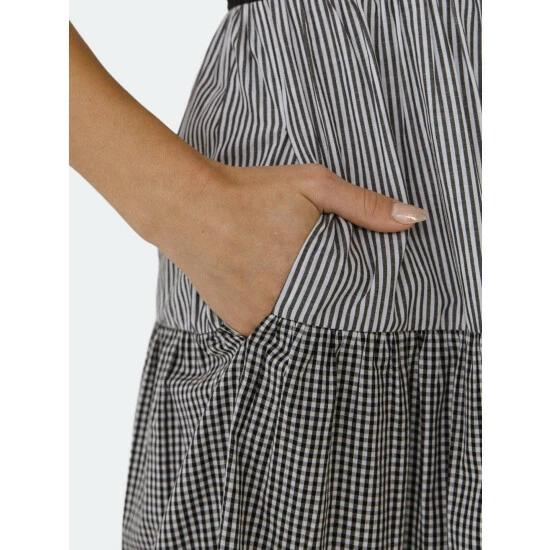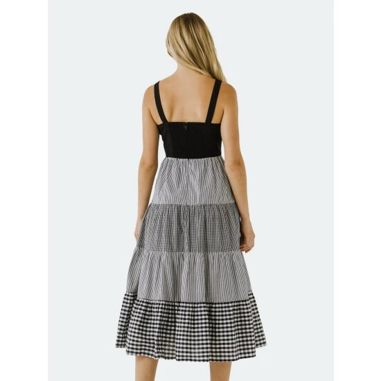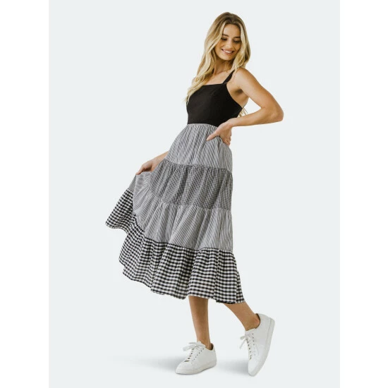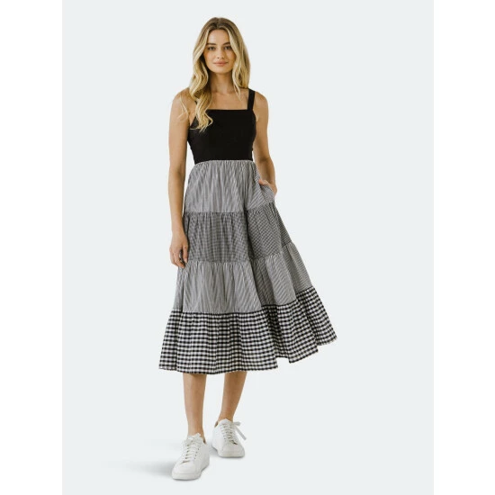 A little bit country, a little bit sophisticate! Be both when you wear this dress. The fitted black bodice with spaghetti straps leads to a midi length skirt. Neither boring nor busy, this skirt combines four tiers of neat black and white gingham and stripes. There are even pockets!