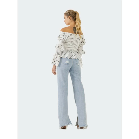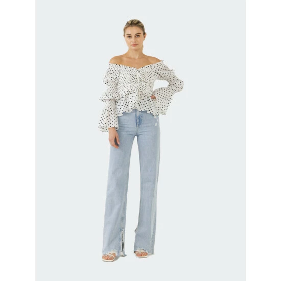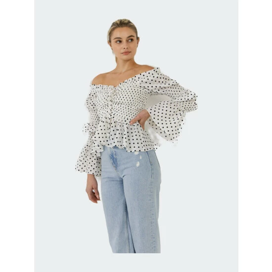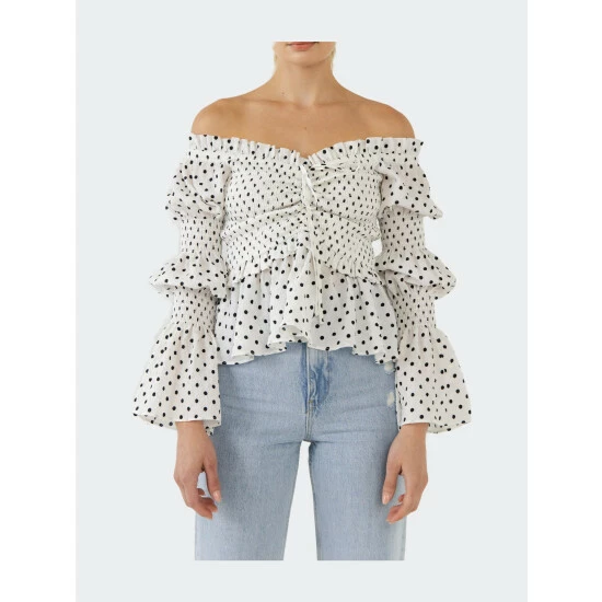 This Dotted Off Shoulder Top from ENGLISH FACTORY is the perfect addition to your wardrobe. With a tie detail at the front and a smocked bodice, this top is both flattering and stylish. The off-shoulder design is perfect for a day in the sun, and the dot print is fun and playful. Pair this top with white jeans and sandals for a chic look.