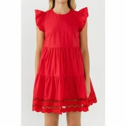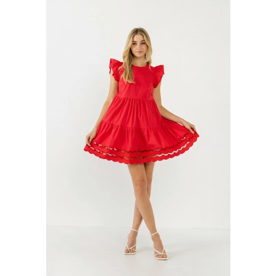 This mini dress is perfect for a night out on the town. With its round neckline and ruffled shoulder, this sleeveless dress is sure to turn heads. The tiered skirt and embroidery detail at the hem add a touch of elegance, while the back keyhole makes it easy to get dressed up or down. Whether you’re headed to a party or out for dinner with your friends, this mini dress is the perfect choice.