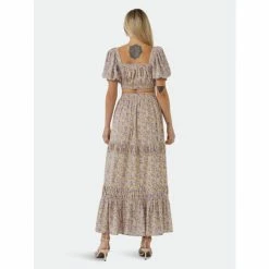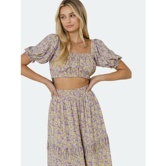 – Cropped top- Floral print- Elastic detail- Puff sleeve- Lined