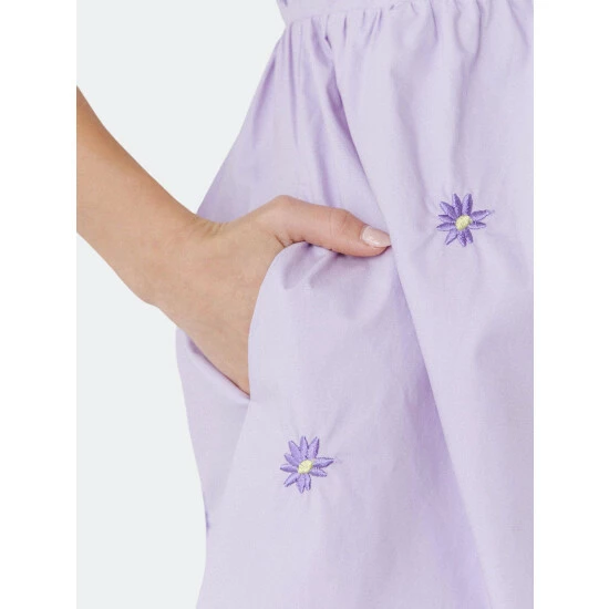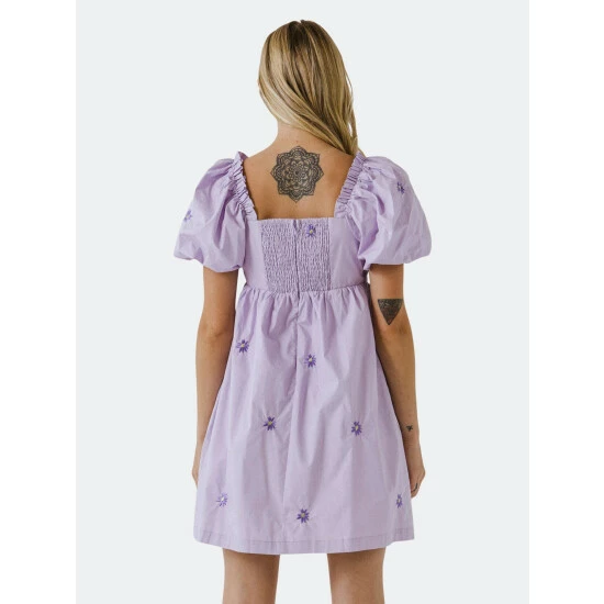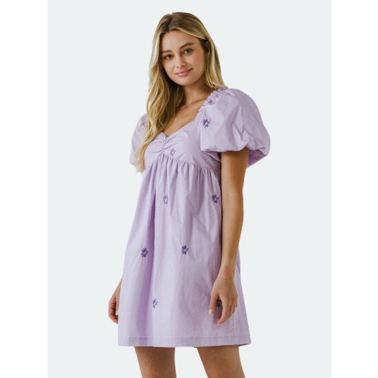 – Floral embroidered- Babydoll design- Mini length- Short puff sleeves- Sweetheart neckline