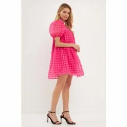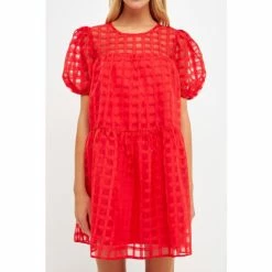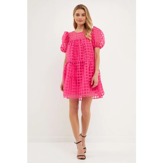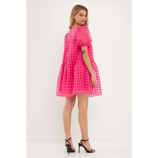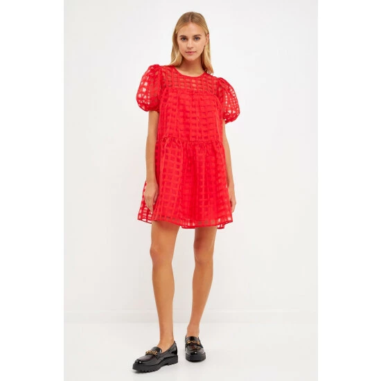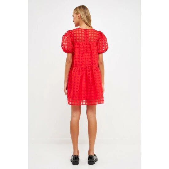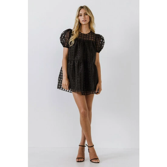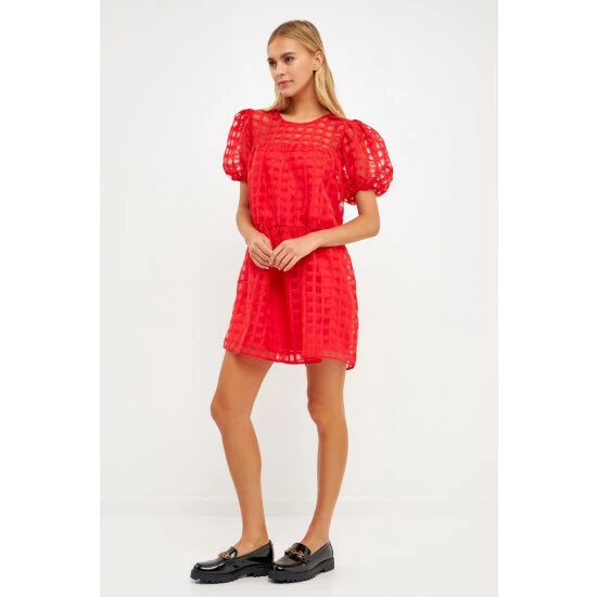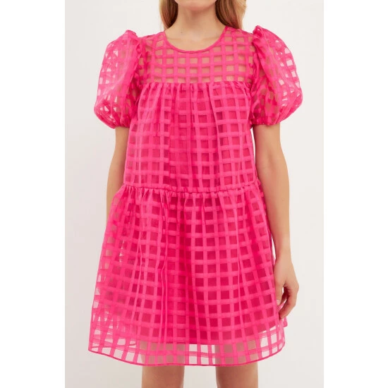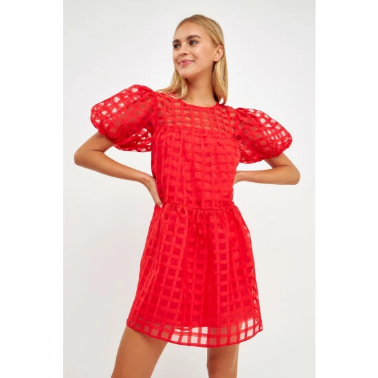 The Gridded Puff Sleeve Dress is a must-have for any fashion lover. Made from sheer fabric with a grid pattern, this dress has a lining to ensure your comfort. It features a round neckline and back zipper, making it easy to put on and take off. The mini length of this dress makes it the perfect choice for any event.