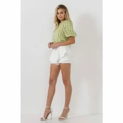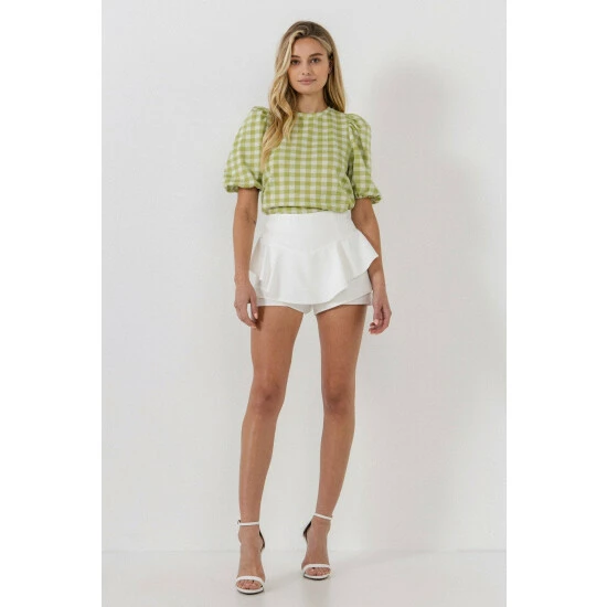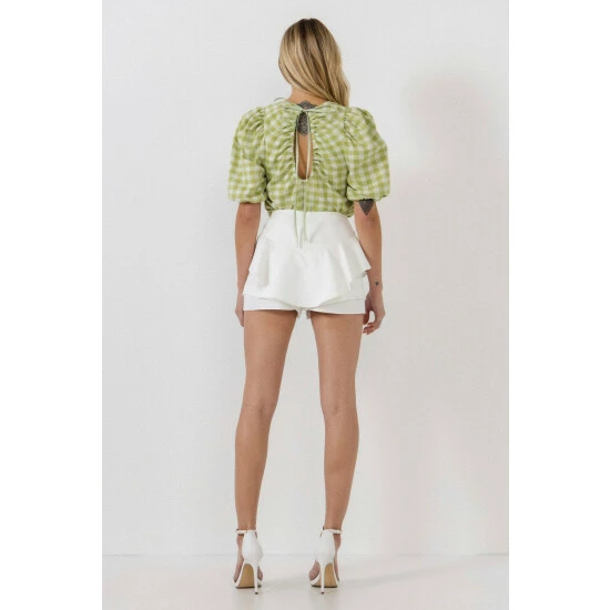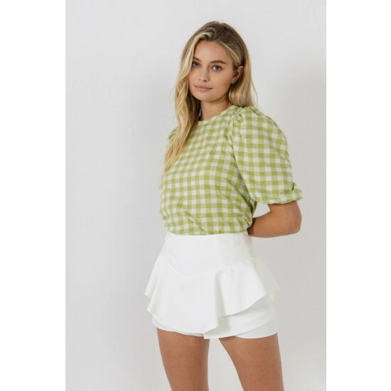 – Gingham knit- Round neckline- Puff half sleeves- Back scrunchie- Back contrast tie- Relaxed fit- Regular length- Non sheer- Total length: 22.50″, Bust: 36.50″