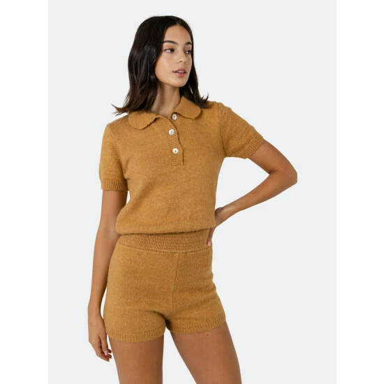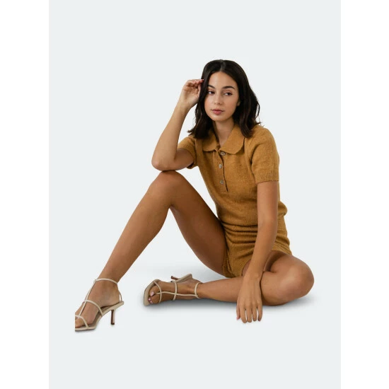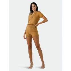 – Button and buttonhole- Short sleeve- Elastic inserted at the waist- Short length- Height 5’11″(180cm) / bust 32″(81cm) / waist 25”(64cm) / hip 36”(91cm)- Total length: 30.8″, bust: 33″, inseam: 2.5″