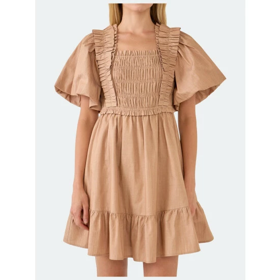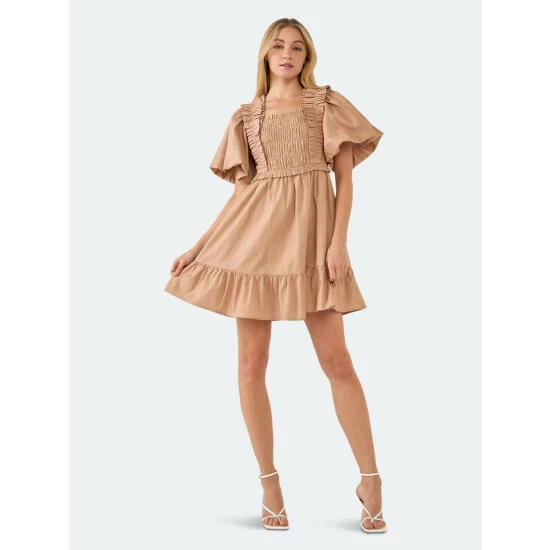 A boutique-worthy baby doll dress with a mini silhouette and ruffle details. The perfect day dress for a picnic or any day time event. Add a pop of contrast with a classic pair of flats and some barely-there jewelry.