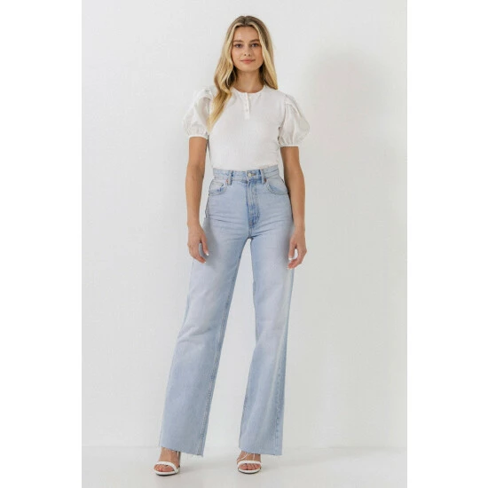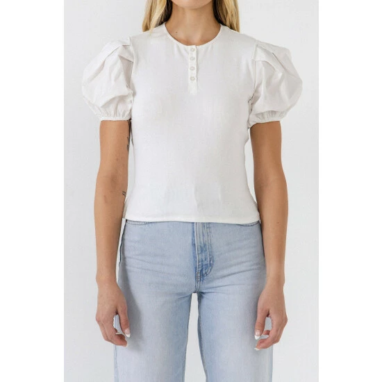 With a mixed media knit bodice and contrast puff sleeves, this top is sure to turn heads. The pleated puff sleeves give it an extra pop of personality, while the henley placket makes it easy to wear. Whether you’re dressing up or dressing down, this top is perfect for any occasion.