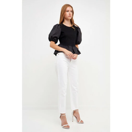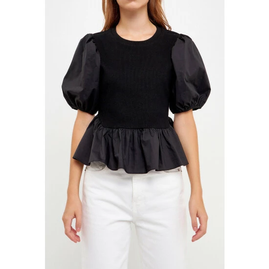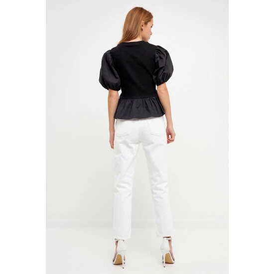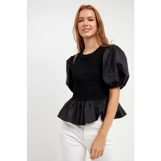 Elevate your everyday style with this mixed-media top. With a cool and relaxed fit, this top is perfect for any day of the week. The puff short sleeve and round neckline give it a stylish touch that you’ll love. Wear it with anything from jeans to skirts- the possibilities are endless.