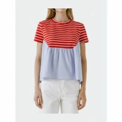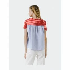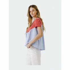 It’s cute and different! This little top combines orange and white stripes on the back/front yoke and on the short sleeves with a shirred bodice in a pale lilac shade. It’s a cropped look that creates a swingy silhouette that’s so easy to wear.