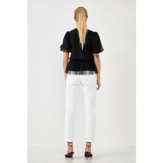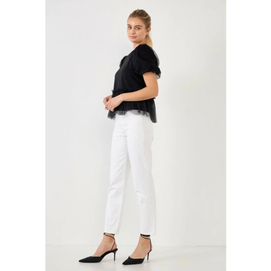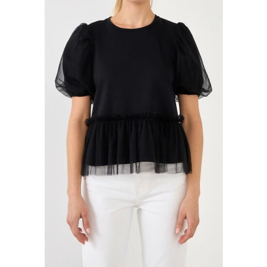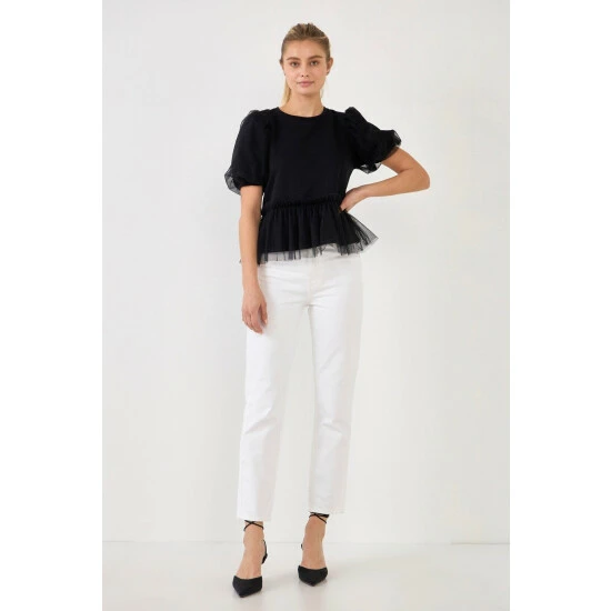 Take a stroll in the garden with this ballerina inspired peplum top. This chic, mixed media top features a tulle peplum and short puff sleeves. Pair it with a denim skirt and your favorite ballet flats for a look that’s perfect for spring.