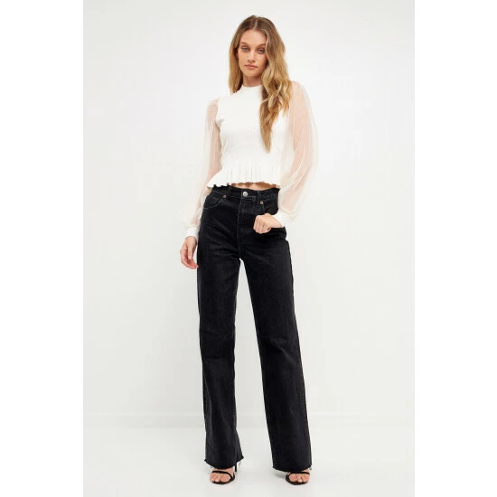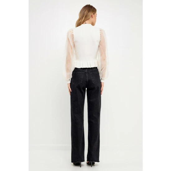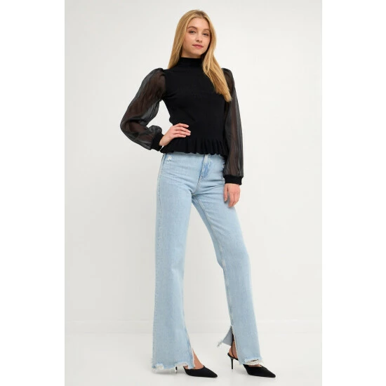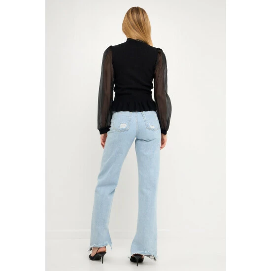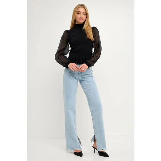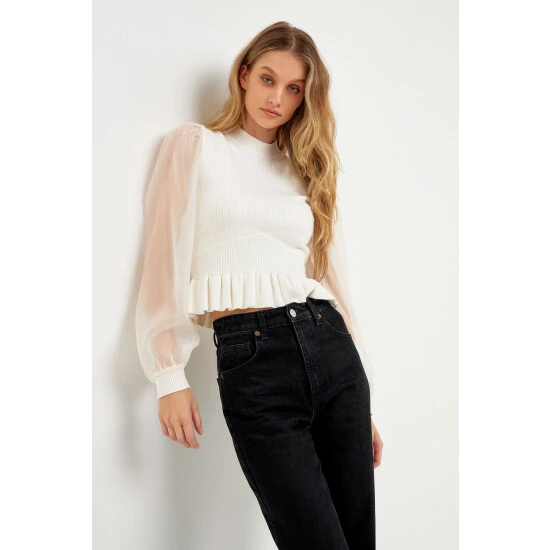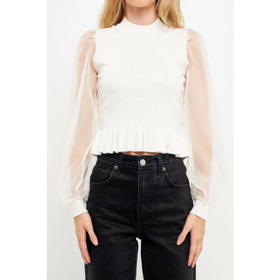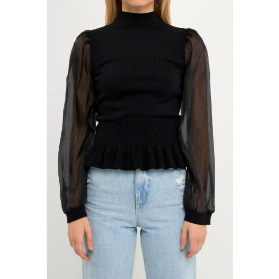 Elevate your style with this knit blouse. With its mixed-media fabrication, this blouse is sure to turn heads. The organza long sleeves and mock neck give it an elevated look, while the knit ribbed waist panel ensures a comfortable fit. Whether you’re dressing up for a special occasion or just want to feel a bit more polished, this top is perfect for the job.