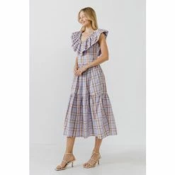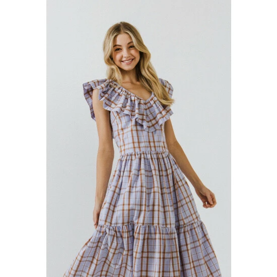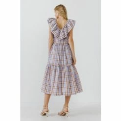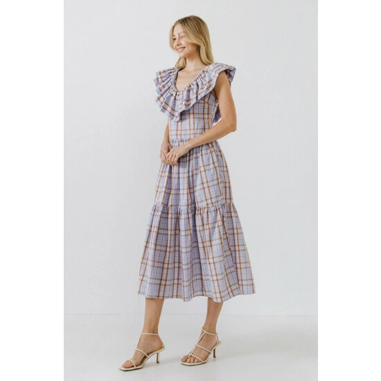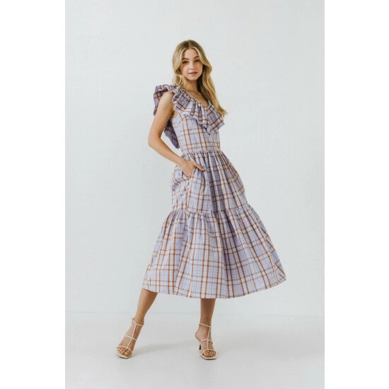 – Plaid print- Side zipper- Neckline with ruffle detail- Midi length- Height: 5’9″ / (175cm)- Bust: 34″ / (86cm)- Waist: 26″(67cm)- Hip: 35″(89cm)- Total length: 51″- Bust: 34″