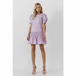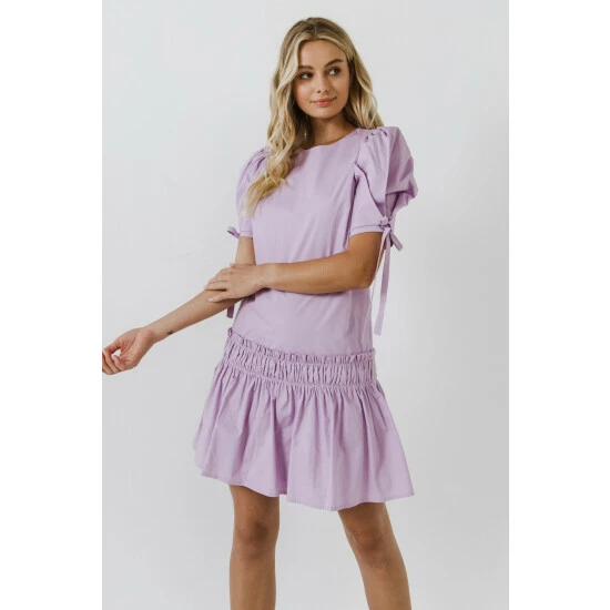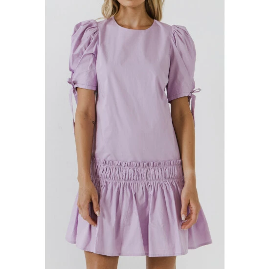 Make a sweet statement in this classic english factory dress. Perfect for spring, this cotton poplin dress features a ruffle detail at the waist and short puff sleeves with ties. This design is the definition of elegant dresses for women. Pair this pretty dress with sandals or wedges for a chic look.