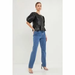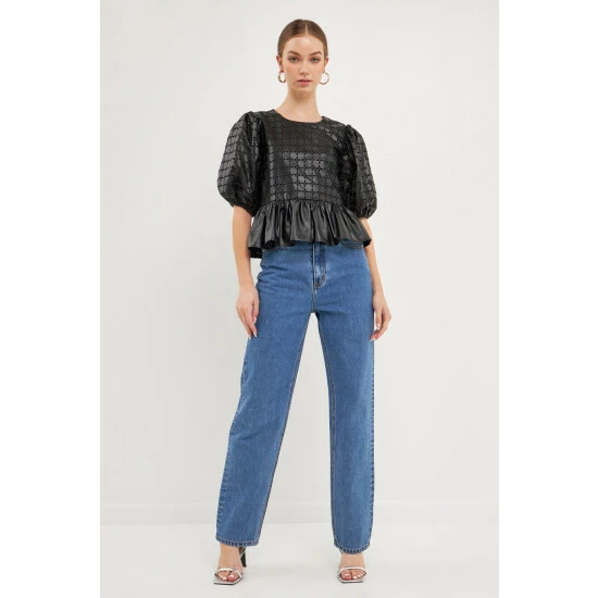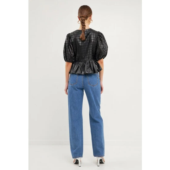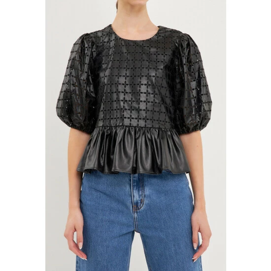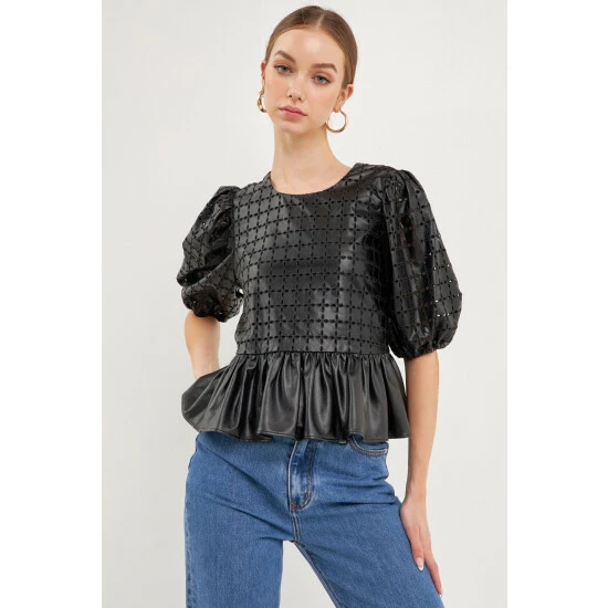 Elevate your style with this faux leather peplum top. We took a classic look and gave it a unique twist by combining an eyelet design and faux leather fabric. You can wear your favorite pair of jeans and sneakers for a more casual look, or dress it up with a skirt and heels for a night out on the town. It’s a must-have for your closet.