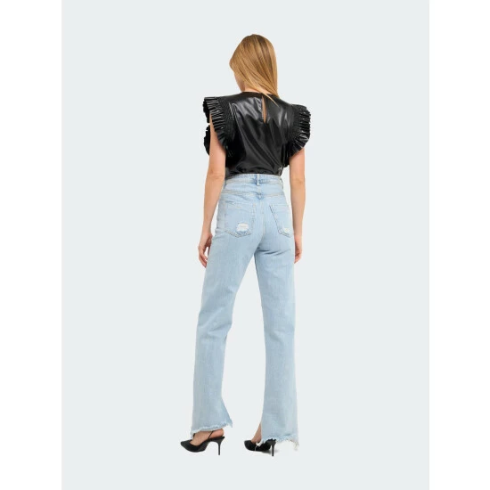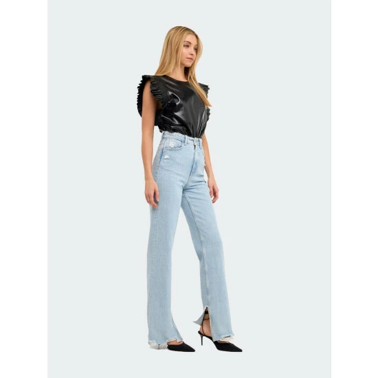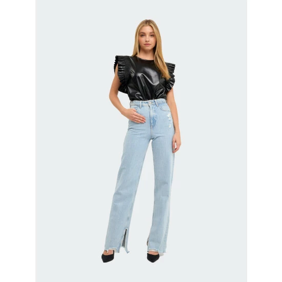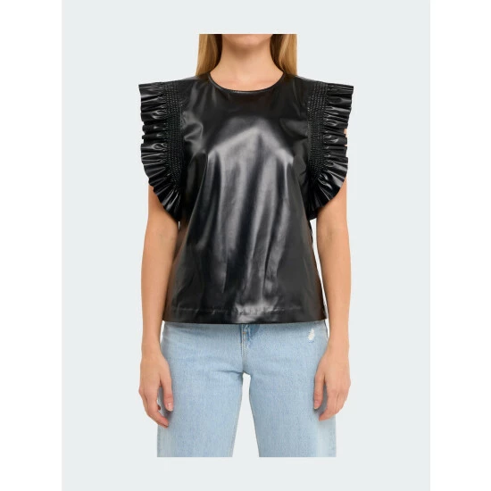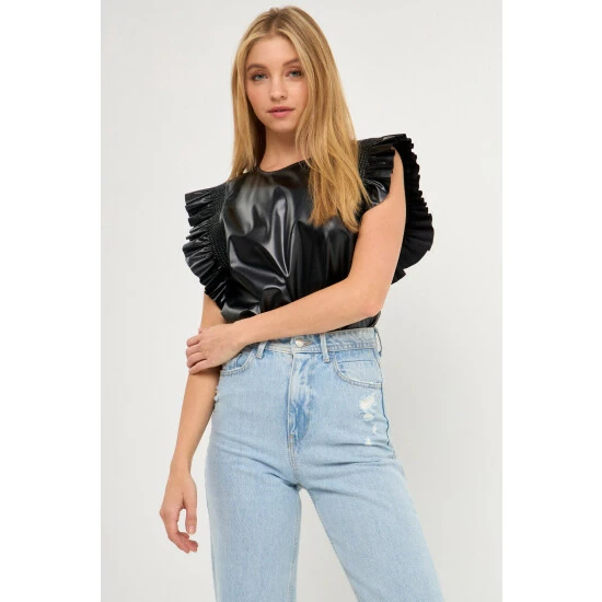 This top is sure to turn heads. With feminine ruffle details and a flattering fit, this top is perfect for any special occasion. Style it with dress pants or a skirt for a look that’s both polished and chic. Made from high-quality PU leather, this top is sure to keep you looking your best.
