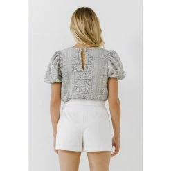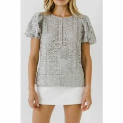 Neat little blouse adds a dressy touch to any pant or skirt. In a neutral shade of pale grey, the cotton lace fabric lends a feminine air to the plain bodice with round neckline. The short puff sleeves continue the theme.