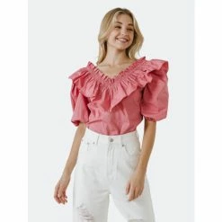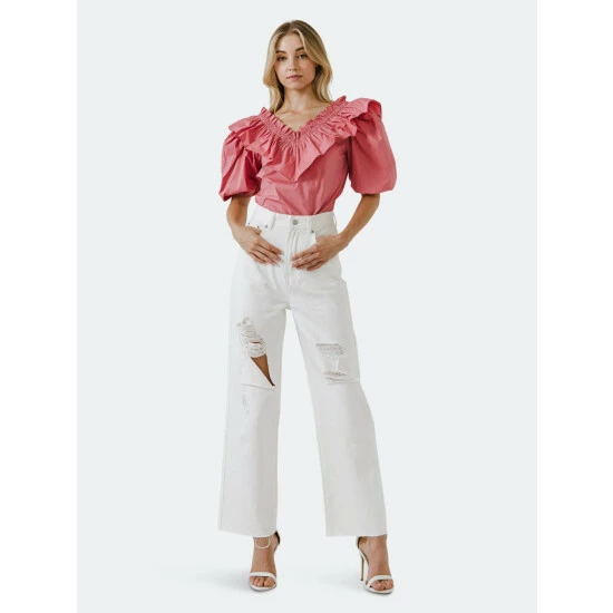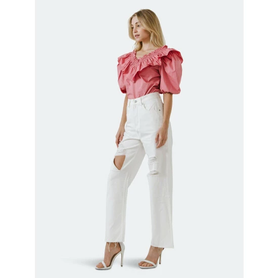 – Ruffle on the neck- V-neckline- Puff sleeve- Iron lowShell: 100% Cotton- Total length: 22.75″ Bust: 37″