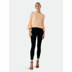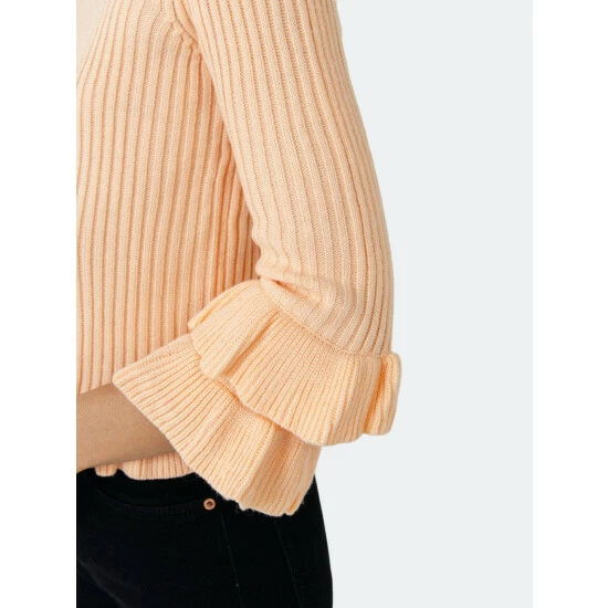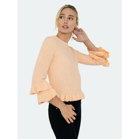 Add some cozy style to your fall wardrobe with this ribbed sweater. The bell sleeves and ruffle hemline give this knit sweater a feminine touch, perfect for pairing with your favorite jeans. With its easy-to-wear shape, this sweater is the perfect addition to your fall essentials.