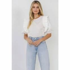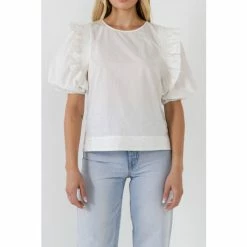 Your new favorite top has arrived! With puff sleeves, a round neckline, and keyhole and button closures at the back, this ruffled top with smocking detail is perfect for any occasion. Whether you’re dressing up for a special event or dressing down for a casual day, this top is sure to make a statement.