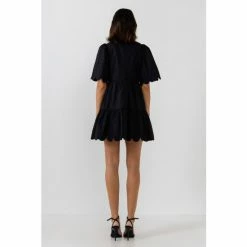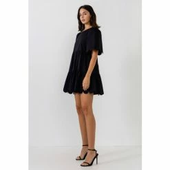 Scallop edge, lined, mini dress with short sleeve. Whether you’re off to a cocktail party or a night out on the town, this short sleeve mini dress will have you looking your best. The scalloped detail adds a touch of elegance, while the form, fitting cut will show off your best assets. Let loose and have fun in this scallop detail mini dress.