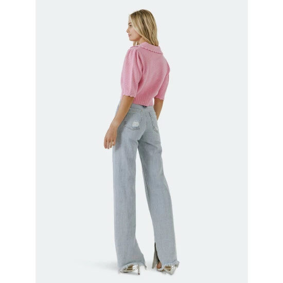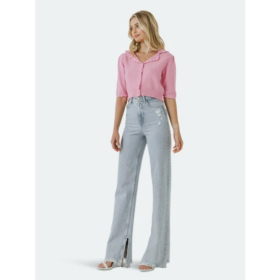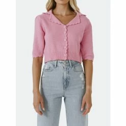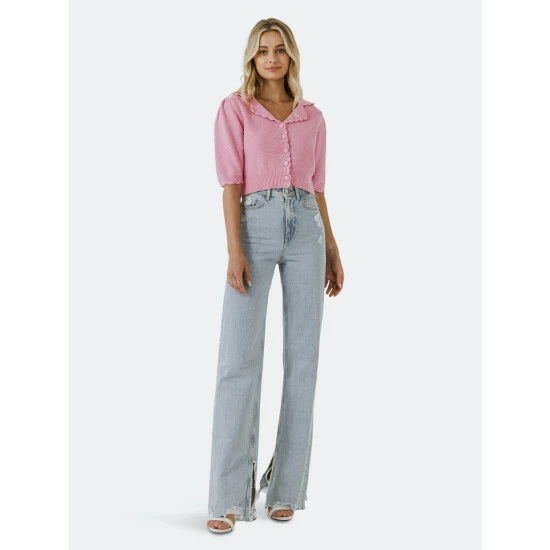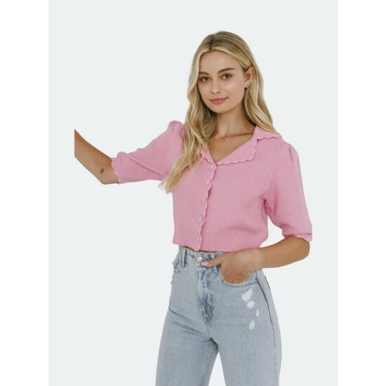 – V-neckline- Scallop edge- Puff sleeve- Cardigan- Total length: 18″ bust: 33″