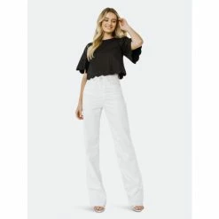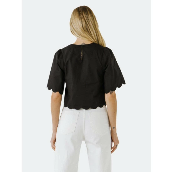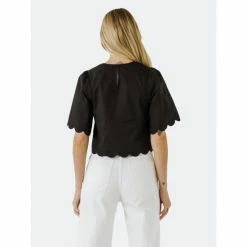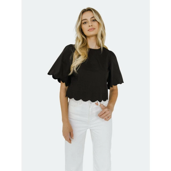 – Solid- Round neckline- Back keyhole- Scalloped half sleeves- Scalloped hem- Cropped- Relaxed fit- Height 5’8”(173cm) / bust 32”(81cm) / waist 25”(67cm) / hip 35”(89cm)- Total length: 19.50″, bust: 38″