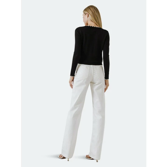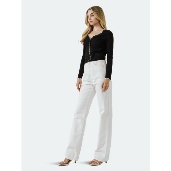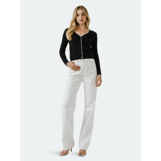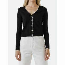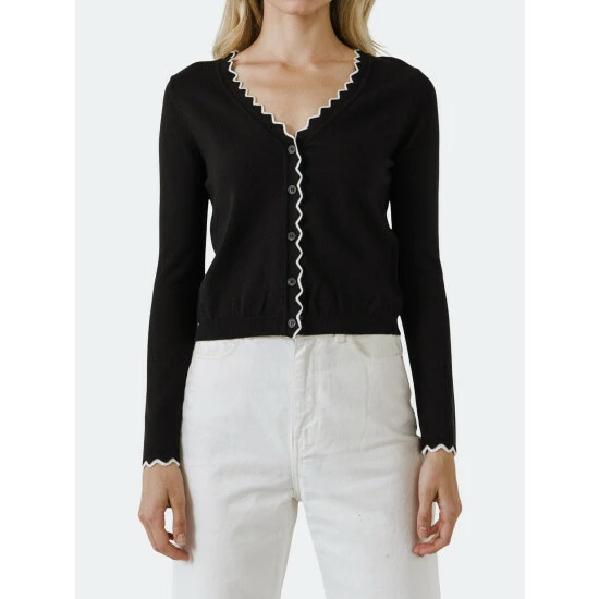 Contrast trim accentuates the scalloped edges of this contemporary-chic and lightweight cardigan.