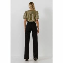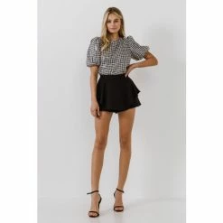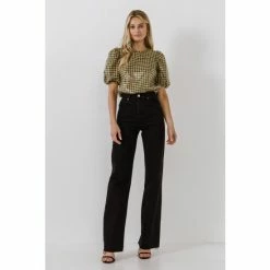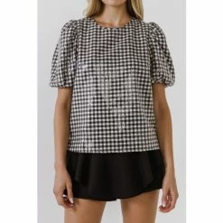 – Sequins- Puff short sleeves- Round neckline- Gingham print- Height 5’8”(173cm) / Bust 32”(81cm) / Waist 25”(67cm) / Hip 35”(89cm)- Total length: 23.75″, Bust: 37.50″
