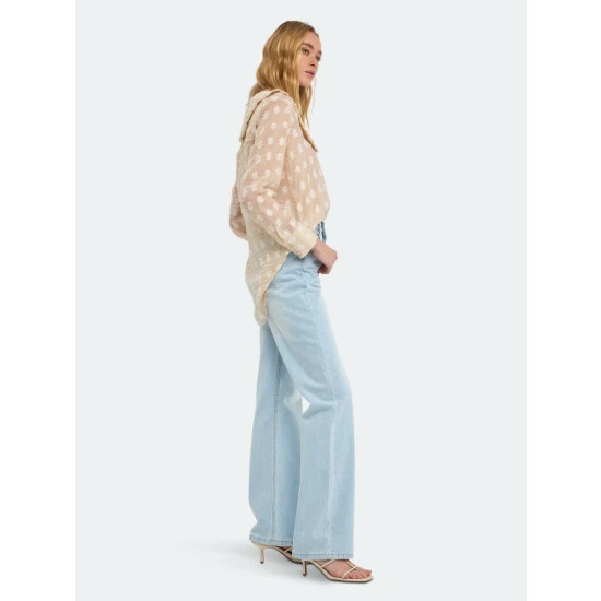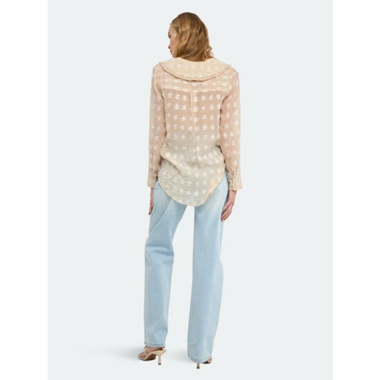 – Sheer fabric- Statement collar- Embroidered fabric- Long sleeves with cuffs- Front button closure- Total length: 30.75″, Bust: 42″