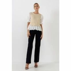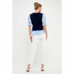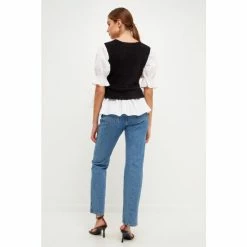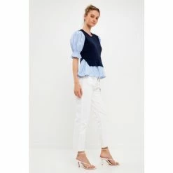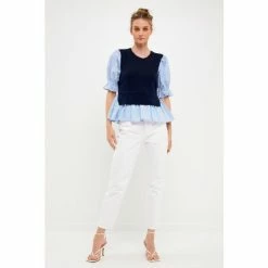 Keep your wardrobe simple and comfortable with the english factory sweater poplin mixed top. This versatile top can be dressed up or down and will look good with any bottom. Wear this sweater poplin mixed top with a skirt or skinny jeans and heels for a fashionable day-to-night look.