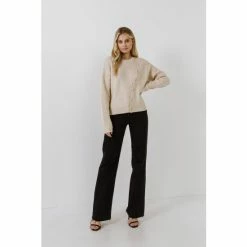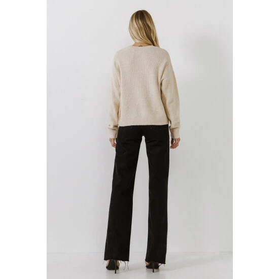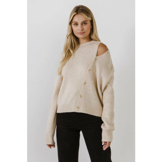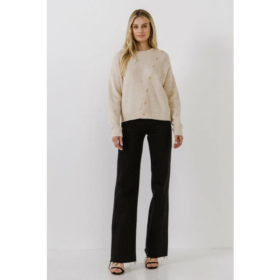 Stay warm and look chic with this sweater from English Factory. You’ll stay cozy and effortlessly stylish with this knit sweater featuring an asymmetrical button detail, round neckline, and long sleeves. This sweater is perfect for any casual occasion.