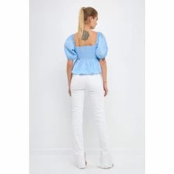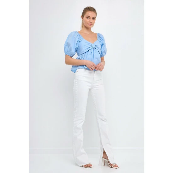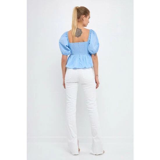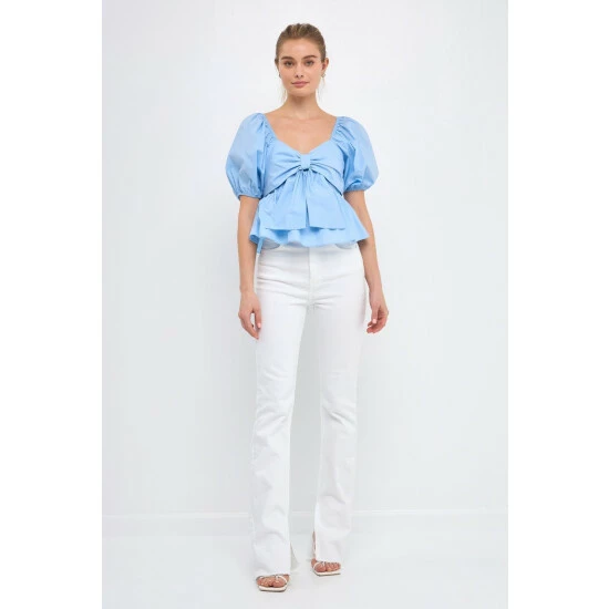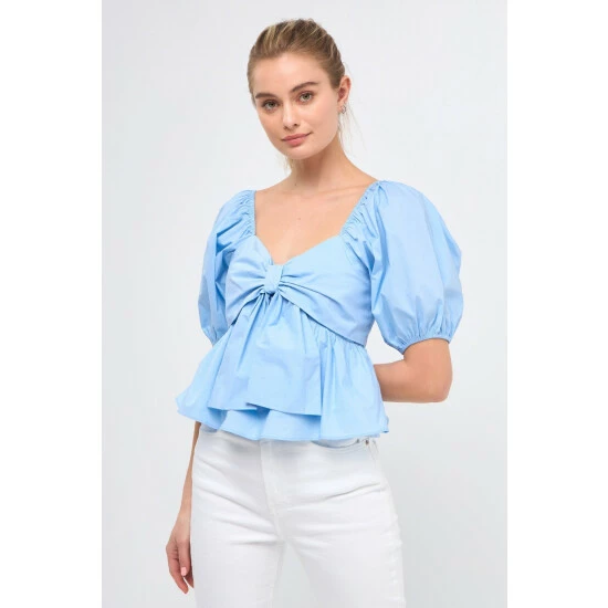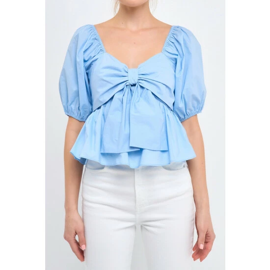 Add a little sweetness to your wardrobe with this adorable top. The front bow detail and peplum skirt give this top a touch of girlish charm, while the back smocking and puff sleeves add a touch of drama. Whether you’re meeting up with friends for brunch or going on a first date, this top is sure to impress.